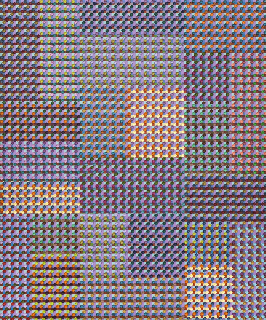 我们面对丹阳的作品,不妨在5米左右的距离欣赏其色彩丰富的调式,可进至1米看他密实层叠的结构,甚至贴近0.3米看那些纯度很高的颜料。在极确切的画面构造与无法预料的阅读之间,丹阳所采用的实验路线却是要把人引入两难境地的。”格式语言”是我们所处时代的深层隐喻。”格”即是元素,也是展开部件,又是”网格化”自身。 人类的当下生存无不是在”格中”的自适、囚困的处境。谁也离不开对”格局”形势的判断来决定其本身的”位格”。世界就如一张巨大的网,远看如地球上看不见的经纬线,近前就像北京的建外SOHO,我们都是被”格式化”的某个格里的某个座位。生活如此沿着坐标系展开:无论春暖花开的绽放,还是严冬记忆的隐藏,无论地上漫步,还是空中飞驰,或如半夜在比特空间的幻游;我们对于记忆的寻觅,开始不再依于山川河流的样子,不再依于小桥古树的指引去寻找你的目的地;而是依于坐标经纬来确认你所要的”位格”点就在这里。即使地震海啸、山河易貌也错不了。 我们如何确认这样的世界——让人类生存在就如丹阳的”实验格局”中所展开的图像表现,如此紧密的逻辑编织,每一步就像走在铁轨上,而且用尽了我们以往在事物、情感的世界中所享受的那些色彩和颜料。是否总要把甜美滋味的单纯与被预设的网格陷阱混合在一起,才能适应眼前的这块花布?还是让我们坐下来往图像的深处慢慢观察:模拟图像(传统胶片图像)在超极限放大后带给我们的模糊、茫然;数码图像的终极像素带给我们的”格式化构造”,世界只给了我们阅读图像的两种选择。这让我们又想去基因与宇宙混沌初开的情境,艺术或许只是带来一些可能,引诱我们到可能世界去编织梦想。